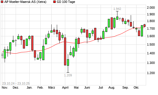 Mit dem Rücksetzer auf 1.707,00 EUR hat die AP Moeller-Maersk A-Aktie am 22.10.2025 die 100-Tage-Linie nach unten gekreuzt.Die AP Moeller-Maersk A-Aktie befindet sich seit dem 30.04.2025 ...weiterlesen