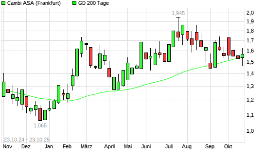 Mit dem Rücksetzer auf 1,49 EUR hat die CAMBI ASA-Aktie am 22.10.2025 die 200-Tage-Linie nach unten gekreuzt.Die CAMBI ASA-Aktie befand sich seit dem 21.10.2025 im langfristigen Aufwärtstrend ...weiterlesen