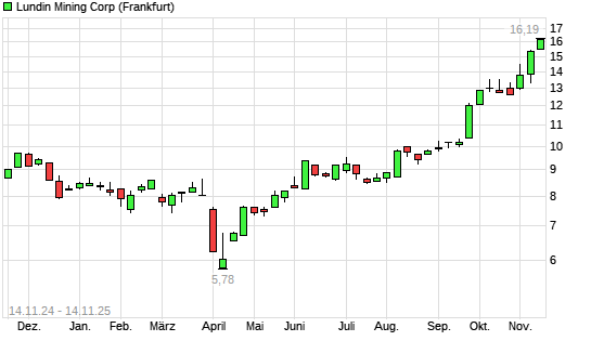 Mit dem Anstieg auf 16,19 EUR hat die Lundin Mining-Aktie (ISIN CA5503721063) am 13.11.2025 ein neues All-Time-High erreicht und damit den Kurs vom 12.11.2025 eingestellt.Die Lundin Mining-Aktie ...weiterlesen