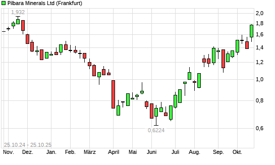 Mit dem Anstieg auf 1,77 EUR hat die Pilbara Minerals-Aktie (ISIN AU000000PLS0) am 24.10.2025 ein neues 6-Monats-Hoch erreicht und damit den Kurs vom 23.10.2025 eingestellt.Die Pilbara Minerals-Aktie ...weiterlesen
