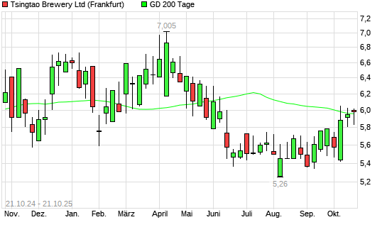 Mit dem Anstieg auf 6,02 EUR hat die Tsingtao Brewery-Aktie am 20.10.2025 die 200-Tage-Linie nach oben gekreuzt.Die Tsingtao Brewery-Aktie befand sich seit dem 15.10.2025 im langfristigen Abwärtstrend ...weiterlesen