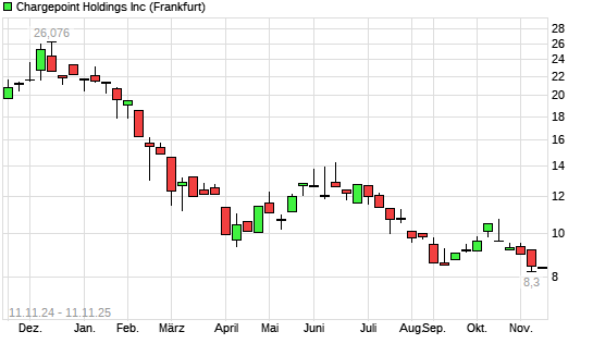 Mit dem Rücksetzer auf 8,35 EUR hat die ChargePoint Holdings-Aktie (ISIN US15961R3030) am 10.11.2025 ein neues All-Time-Low erreicht und damit den Kurs vom 07.11.2025 eingestellt.Der Abstand ...weiterlesen