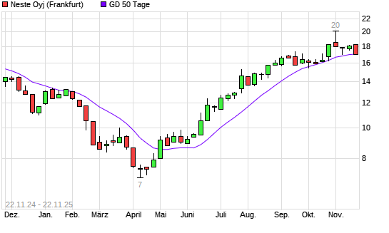 Mit dem Rücksetzer auf 17,00 EUR hat die Neste OYJ-Aktie am 21.11.2025 die 50-Tage-Linie nach unten gekreuzt.Die Neste OYJ-Aktie befindet sich seit dem 01.07.2025 im langfristigen Aufwärtstrend ...weiterlesen