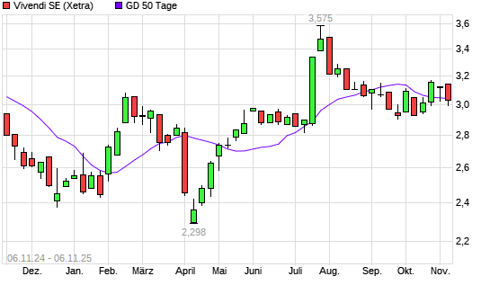 Mit dem Anstieg auf 3,02 EUR hat die Vivendi-Aktie am 05.11.2025 die 50-Tage-Linie nach oben gekreuzt.Die Vivendi-Aktie befindet sich seit dem 11.04.2025 im langfristigen Aufwärtstrend und hat ...weiterlesen
