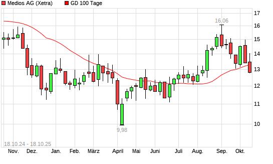 Mit dem Rücksetzer auf 13,14 EUR hat die Medios-Aktie am 17.10.2025 die 100-Tage-Linie nach unten gekreuzt.Die Medios-Aktie befindet sich seit dem 04.08.2025 im langfristigen Aufwärtstrend ...weiterlesen