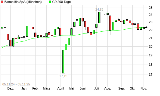 Mit dem Rücksetzer auf 22,24 EUR hat die BANCA IFIS S.P.A.-Aktie am 04.11.2025 die 200-Tage-Linie nach unten gekreuzt.Die BANCA IFIS S.P.A.-Aktie befand sich seit dem 03.11.2025 im langfristigen ...weiterlesen