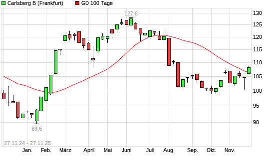 Mit dem Anstieg auf 108,20 EUR hat die Carlsberg B-Aktie am 26.11.2025 die 100-Tage-Linie nach oben gekreuzt.Die Carlsberg B-Aktie befindet sich seit dem 01.08.2025 im langfristigen Abwärtstrend ...weiterlesen