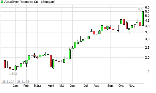 Mit dem Anstieg auf 5,44 EUR hat die Abrasilver Resource-Aktie (ISIN CA00379L3048) am 27.11.2025 ein neues All-Time-High erreicht und damit den Kurs vom 26.11.2025 eingestellt.Die Abrasilver ...weiterlesen
