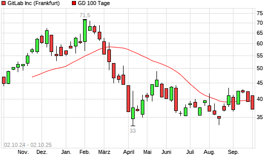 Mit dem Rücksetzer auf 37,10 EUR hat die GitLab-Aktie am 01.10.2025 die 100-Tage-Linie nach unten gekreuzt.Der Abstand zur 200-Tage-Linie beträgt aktuell -18,80%.