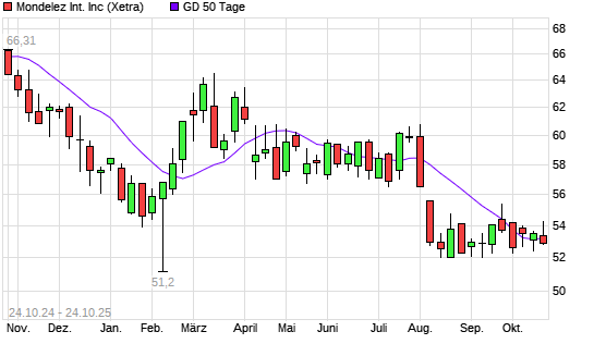Mit dem Rücksetzer auf 52,51 EUR hat die Mondelez-Aktie am 23.10.2025 die 50-Tage-Linie nach unten gekreuzt.Die Mondelez-Aktie befindet sich seit dem 30.07.2025 im langfristigen Abwärtstrend ...weiterlesen