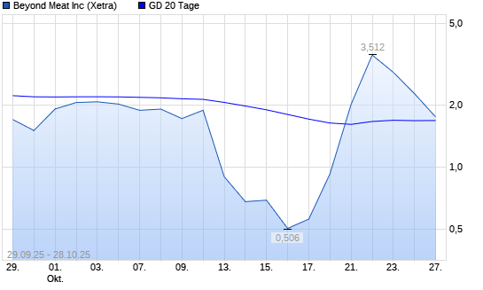 Mit dem Rücksetzer auf 1,56 EUR hat die Beyond Meat-Aktie am 27.10.2025 die 20-Tage-Linie nach unten gekreuzt.Die Beyond Meat-Aktie befindet sich seit dem 23.10.2025 im langfristigen Abwärtstrend ...weiterlesen