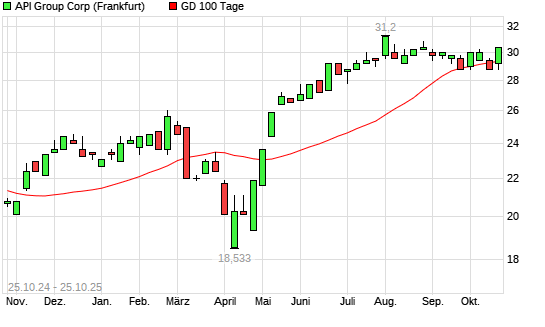 Mit dem Anstieg auf 30,40 EUR hat die API Group-Aktie am 24.10.2025 die 100-Tage-Linie nach oben gekreuzt.Die API Group-Aktie befindet sich seit dem 02.05.2025 im langfristigen Aufwärtstrend ...weiterlesen