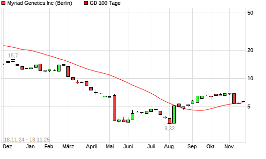 Mit dem Anstieg auf 5,75 EUR hat die Myriad Genetics-Aktie am 17.11.2025 die 100-Tage-Linie nach oben gekreuzt.Die Myriad Genetics-Aktie befindet sich seit dem 04.11.2025 im langfristigen Abwärtstrend ...weiterlesen
