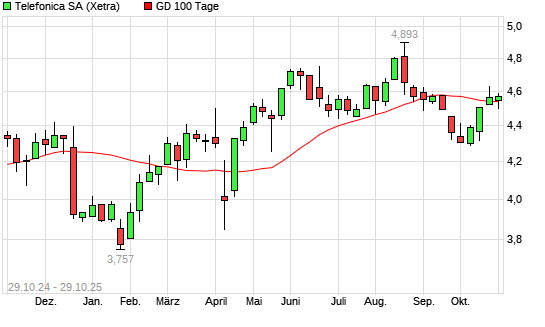 Mit dem Rücksetzer auf 4,53 EUR hat die Telefónica-Aktie am 28.10.2025 die 100-Tage-Linie nach unten gekreuzt.Die Telefónica-Aktie befindet sich seit dem 14.10.2025 im langfristigen ...weiterlesen