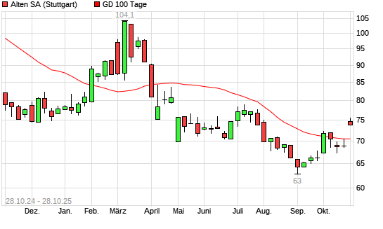 Mit dem Anstieg auf 75,30 EUR hat die Alten-Aktie am 27.10.2025 die 100-Tage-Linie nach oben gekreuzt.Die Alten-Aktie befindet sich seit dem 31.03.2025 im langfristigen Abwärtstrend und hat ...weiterlesen