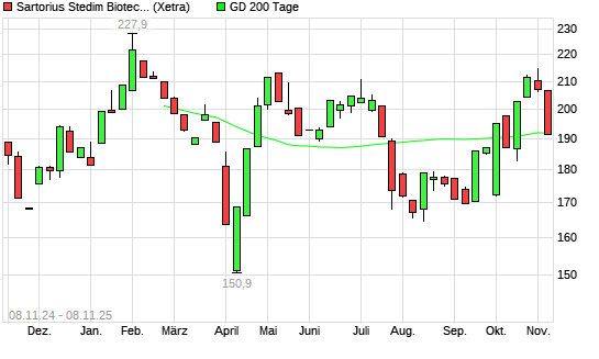 Mit dem Rücksetzer auf 189,90 EUR hat die Sartorius Stedim Biotech-Aktie am 07.11.2025 die 200-Tage-Linie nach unten gekreuzt.Die Sartorius Stedim Biotech-Aktie befand sich seit dem 16.10.2025 ...weiterlesen