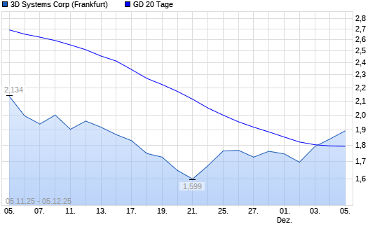 Mit dem Anstieg auf 1,84 EUR hat die 3D Systems-Aktie am 04.12.2025 die 20-Tage-Linie nach oben gekreuzt.Die 3D Systems-Aktie befindet sich seit dem 05.11.2025 im langfristigen Abwärtstrend ...weiterlesen