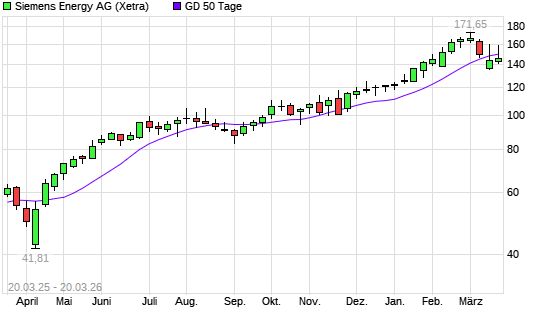 Mit dem Rücksetzer auf 146,40 EUR hat die Siemens Energy-Aktie am 19.03.2026 die 50-Tage-Linie nach unten gekreuzt.Die Siemens Energy-Aktie befindet sich seit dem 27.02.2024 ...weiterlesen
