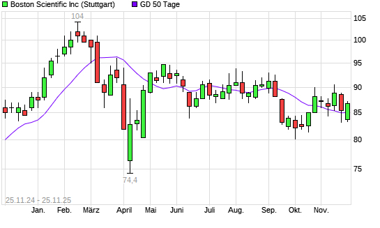 Mit dem Anstieg auf 85,00 EUR hat die Boston Scientific-Aktie am 24.11.2025 die 50-Tage-Linie nach oben gekreuzt.Die Boston Scientific-Aktie befindet sich seit dem 14.11.2025 im langfristigen ...weiterlesen