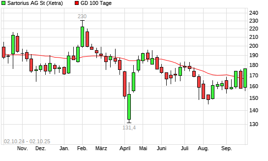Mit dem Anstieg auf 175,00 EUR hat die Sartorius-Aktie am 01.10.2025 die 100-Tage-Linie nach oben gekreuzt.Die Sartorius-Aktie befindet sich seit dem 04.07.2025 im langfristigen Abwärtstrend ...weiterlesen