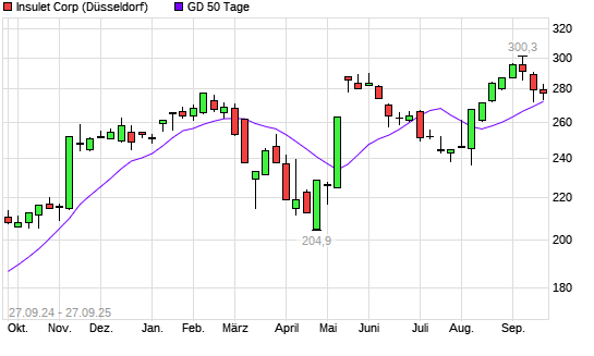 Mit dem Rücksetzer auf 272,10 EUR hat die Insulet Corp-Aktie am 26.09.2025 die 50-Tage-Linie nach unten gekreuzt.Die Insulet Corp-Aktie befindet sich seit dem 07.08.2025 im langfristigen ...weiterlesen