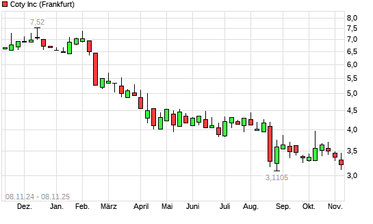 Mit dem Rücksetzer auf 3,21 EUR hat die Coty-Aktie (ISIN US2220702037) am 07.11.2025 ein neues 5-Jahres-Tief erreicht und damit den Kurs vom 26.08.2025 eingestellt.Die Coty-Aktie befindet ...weiterlesen