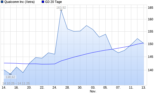 Mit dem Rücksetzer auf 150,26 EUR hat die Qualcomm-Aktie am 13.11.2025 die 20-Tage-Linie nach unten gekreuzt.Die Qualcomm-Aktie befindet sich seit dem 16.10.2025 im langfristigen Aufwärtstrend ...weiterlesen