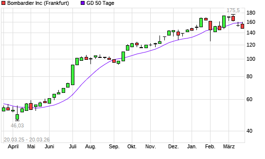 Mit dem Rücksetzer auf 149,75 EUR hat die Bombardier-Aktie am 19.03.2026 die 50-Tage-Linie nach unten gekreuzt.Die Bombardier-Aktie befindet sich seit dem 04.06.2025 im ...weiterlesen