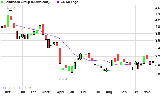 Mit dem Anstieg auf 3,02 EUR hat die Lendlease Group-Aktie am 10.11.2025 die 50-Tage-Linie nach oben gekreuzt.Die Lendlease Group-Aktie befindet sich seit dem 31.10.2025 im langfristigen Abwärtstrend ...weiterlesen