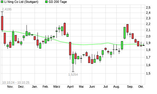 Mit dem Rücksetzer auf 1,83 EUR hat die Li Ning Co-Aktie am 09.10.2025 die 200-Tage-Linie nach unten gekreuzt.Die Li Ning Co-Aktie befand sich seit dem 08.10.2025 im langfristigen Aufwärtstrend ...weiterlesen