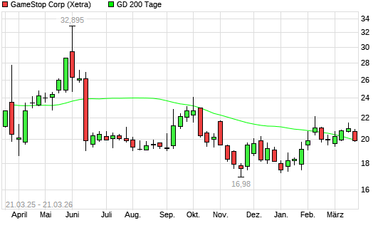 Mit dem Rücksetzer auf 19,43 EUR hat die GameStop-Aktie am 20.03.2026 die 200-Tage-Linie nach unten gekreuzt.Die GameStop-Aktie befand sich seit dem 25.02.2026 im ...weiterlesen