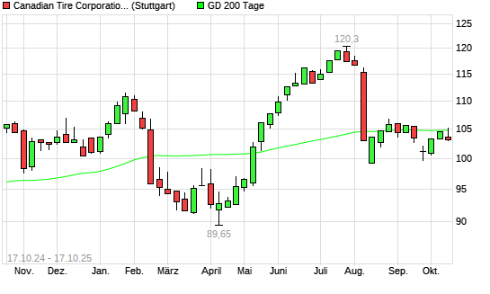Mit dem Rücksetzer auf 103,60 EUR hat die Canadian Tire-Aktie am 16.10.2025 die 200-Tage-Linie nach unten gekreuzt.Die Canadian Tire-Aktie befand sich seit dem 14.10.2025 im langfristigen ...weiterlesen