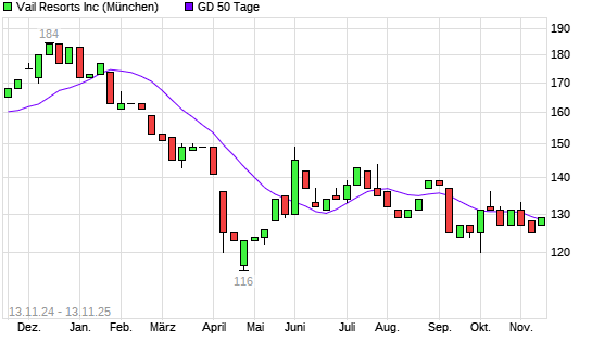 Mit dem Anstieg auf 128,00 EUR hat die Vail Resorts-Aktie am 12.11.2025 die 50-Tage-Linie nach oben gekreuzt.Die Vail Resorts-Aktie befindet sich seit dem 29.01.2025 im langfristigen Abwärtstrend ...weiterlesen