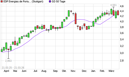 Mit dem Rücksetzer auf 4,25 EUR hat die EDP-Aktie am 20.03.2026 die 50-Tage-Linie nach unten gekreuzt.Die EDP-Aktie befindet sich seit dem 16.05.2025 im langfristigen ...weiterlesen