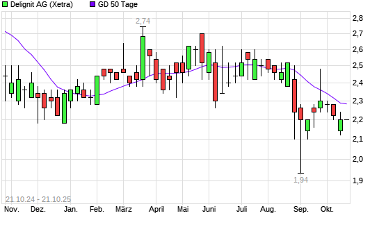 Mit dem Rücksetzer auf 2,14 EUR hat die Delignit-Aktie am 20.10.2025 die 50-Tage-Linie nach unten gekreuzt.Die Delignit-Aktie befindet sich seit dem 26.08.2025 im langfristigen Abwärtstrend ...weiterlesen