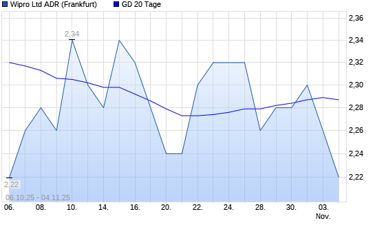 Mit dem Rücksetzer auf 2,26 EUR hat die Wipro ADR-Aktie am 03.11.2025 die 20-Tage-Linie nach unten gekreuzt.Der Abstand zur 200-Tage-Linie beträgt aktuell -13,46%. ...weiterlesen