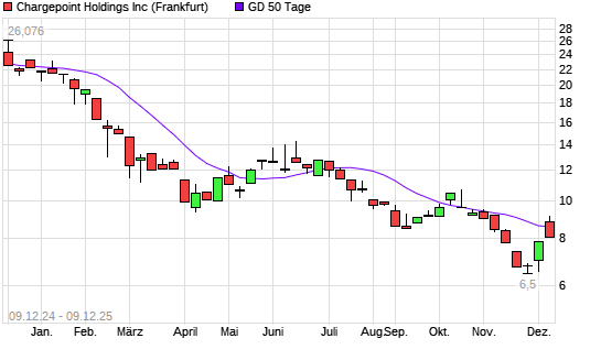 Mit dem Anstieg auf 8,70 EUR hat die ChargePoint Holdings-Aktie am 08.12.2025 die 50-Tage-Linie nach oben gekreuzt.Der Abstand zur 200-Tage-Linie beträgt aktuell -17,24%. ##trendBox## ...weiterlesen
