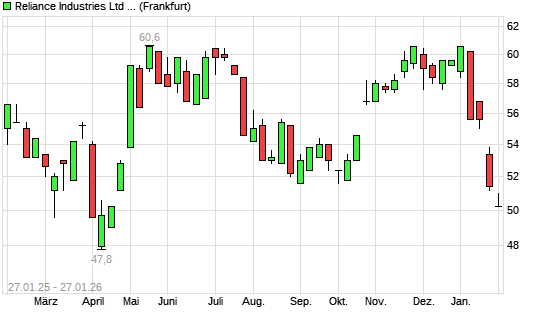 Mit dem Rücksetzer auf 51,00 EUR hat die Reliance Industries GDR-Aktie (ISIN US7594701077) am 26.01.2026 ein neues 6-Monats-Tief erreicht und damit den Kurs vom 23.01.2026 eingestellt.Die ...weiterlesen