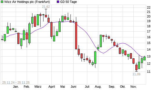 Mit dem Anstieg auf 12,95 EUR hat die Wizz Air Holdings-Aktie am 24.11.2025 die 50-Tage-Linie nach oben gekreuzt.Die Wizz Air Holdings-Aktie befindet sich seit dem 05.06.2025 im langfristigen ...weiterlesen