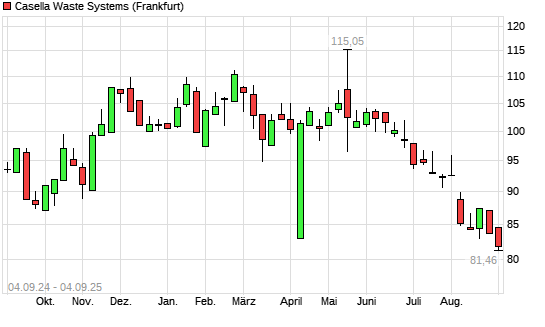 Mit dem Rücksetzer auf 81,86 EUR hat die Casella Waste Systems-Aktie (ISIN US1474481041) am 03.09.2025 ein neues 12-Monats-Tief erreicht und damit den Kurs vom 02.09.2025 eingestellt.Die ...weiterlesen