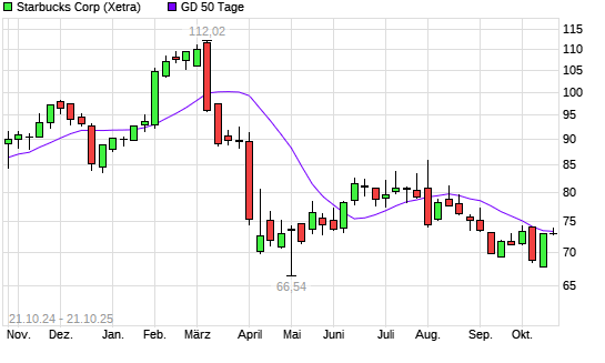 Mit dem Rücksetzer auf 72,60 EUR hat die Starbucks-Aktie am 20.10.2025 die 50-Tage-Linie nach unten gekreuzt.Die Starbucks-Aktie befindet sich seit dem 03.04.2025 im langfristigen Abwärtstrend ...weiterlesen