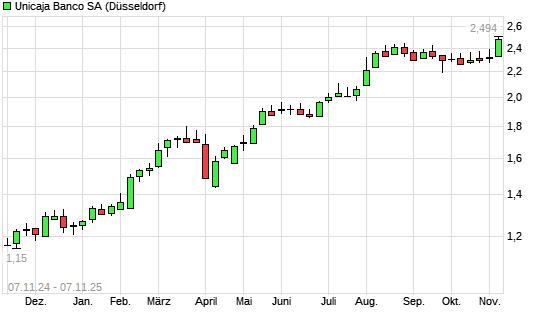 Mit dem Anstieg auf 2,46 EUR hat die UNICAJA BANCO SA-Aktie (ISIN ES0180907000) am 06.11.2025 ein neues All-Time-High erreicht und damit den Kurs vom 25.08.2025 eingestellt.Die UNICAJA BANCO ...weiterlesen