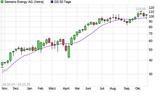 Mit dem Anstieg auf 99,50 EUR hat die Siemens Energy-Aktie am 23.10.2025 die 50-Tage-Linie nach oben gekreuzt.Die Siemens Energy-Aktie befindet sich seit dem 27.02.2024 im langfristigen Aufwärtstrend ...weiterlesen