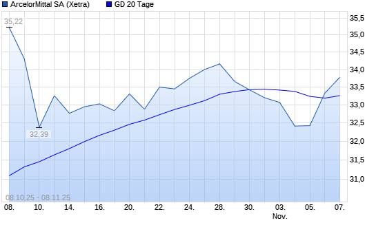 Mit dem Anstieg auf 34,00 EUR hat die ArcelorMittal-Aktie am 07.11.2025 die 20-Tage-Linie nach oben gekreuzt.Die ArcelorMittal-Aktie befindet sich seit dem 11.04.2025 im langfristigen Aufwärtstrend ...weiterlesen