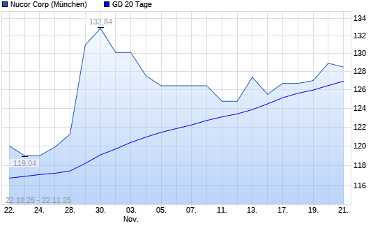 Mit dem Rücksetzer auf 126,54 EUR hat die Nucor-Aktie am 21.11.2025 die 20-Tage-Linie nach unten gekreuzt.Die Nucor-Aktie befindet sich seit dem 21.10.2025 im langfristigen Aufwärtstrend ...weiterlesen