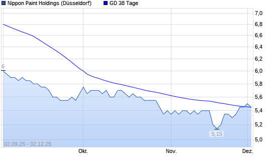 Mit dem Anstieg auf 5,55 EUR hat die Nippon Paint-Aktie am 01.12.2025 die 38-Tage-Linie nach oben gekreuzt.Die Nippon Paint-Aktie befindet sich seit dem 14.08.2025 im langfristigen Abwärtstrend ...weiterlesen