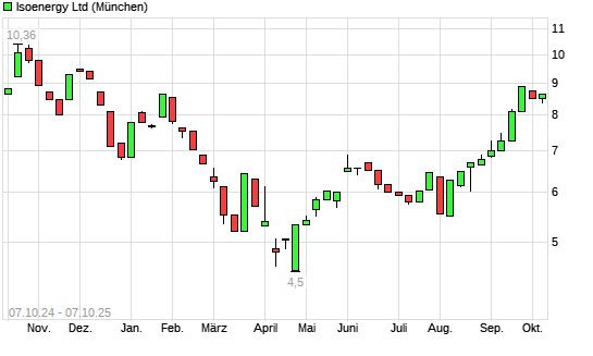 Mit dem Anstieg auf 8,87 EUR hat die Isoenergy-Aktie (ISIN CA46500E8678) am 06.10.2025 ein neues 6-Monats-Hoch erreicht und damit den Kurs vom 24.09.2025 eingestellt.Die Isoenergy-Aktie befindet ...weiterlesen