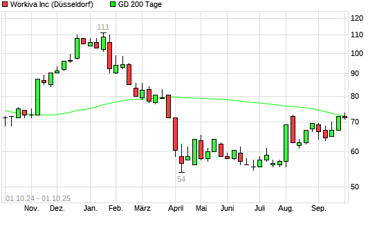 Mit dem Rücksetzer auf 72,50 EUR hat die Workiva-Aktie am 30.09.2025 die 200-Tage-Linie nach unten gekreuzt.Die Workiva-Aktie befand sich seit dem 29.09.2025 im langfristigen Aufwärtstrend ...weiterlesen