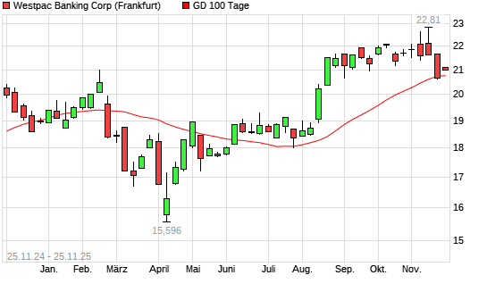 Mit dem Anstieg auf 21,01 EUR hat die Westpac Banking-Aktie am 24.11.2025 die 100-Tage-Linie nach oben gekreuzt.Die Westpac Banking-Aktie befindet sich seit dem 05.08.2025 im langfristigen Aufwärtstrend ...weiterlesen