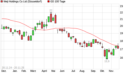Mit dem Anstieg auf 17,70 EUR hat die MEIJI Holdings Co-Aktie am 19.11.2025 die 100-Tage-Linie nach oben gekreuzt.Die MEIJI Holdings Co-Aktie befindet sich seit dem 12.05.2025 im langfristigen ...weiterlesen